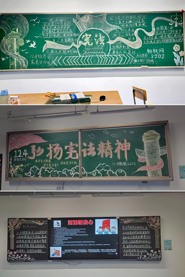 各班团支部以文字、图画相结合的形式在教室黑板绘制粉笔板报。“维护宪法权威,捍卫宪法尊严,保证宪法实施!”“宪法驻我心,法律伴我行!”以端正字迹书写出宪法的历史、内容与重要意义,以飘扬的绸带、庄重的华表、鲜红的旗帜与生动的花鸟装点,最终呈现出一幅幅寓意与美观并存的黑板报。在团支部成员们合作绘制板报的过程中,宪法精神也更加深入这些青年大学生们的心中。